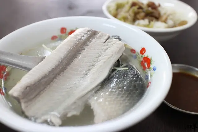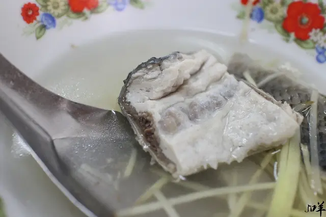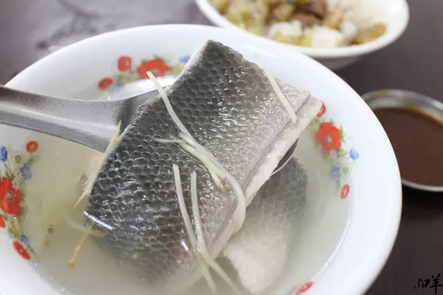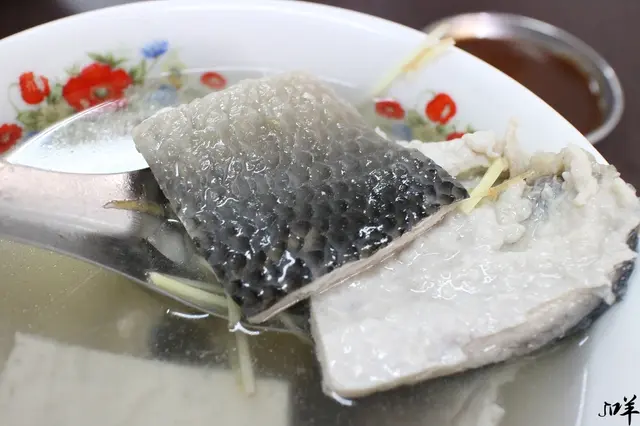 從側面看會比較清楚一些,趕緊來上一口吧!裹漿魚皮湯,魚湯有放上薑絲搭配,放的不會太多因此喝起來不會太辣,整體調味還滿順口的,接著來口魚皮吧。