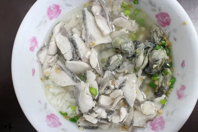 海產粥40元,蚵蚵和虱目魚肉加上蒜酥搭配,湯喝起來順口,蒜酥也增添了不少風味,整體平實。