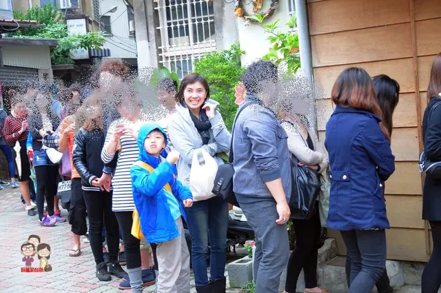 一邊是引頸期盼的長長人龍,另一邊則是母子悠閒的享受著美味,