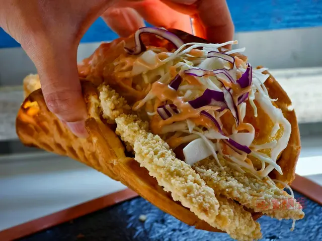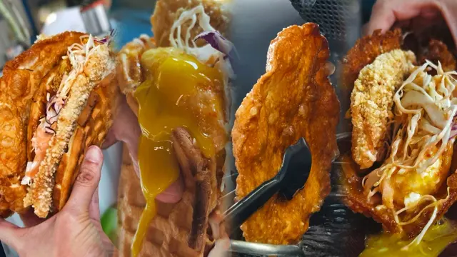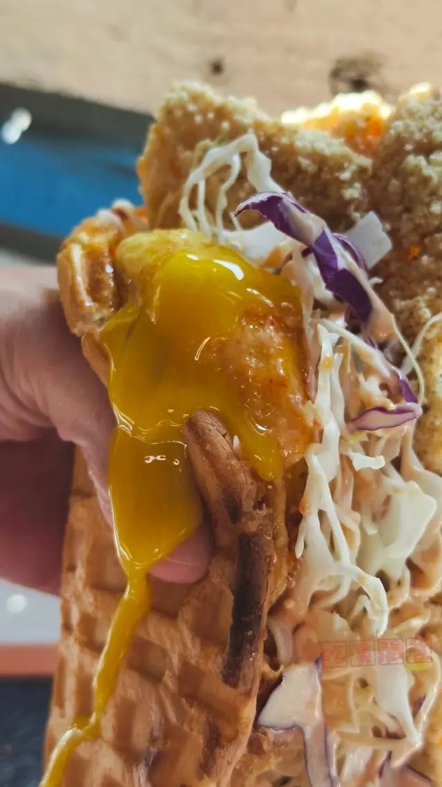 當天還看到一位客人買不到炸蛋蔥油餅,因為當天是鬆餅日,機車騎出去又回來試試鬆餅,沒多久又回來買了好幾個,看來這鬆餅告雞肉或是魚肉都是惹人愛..
