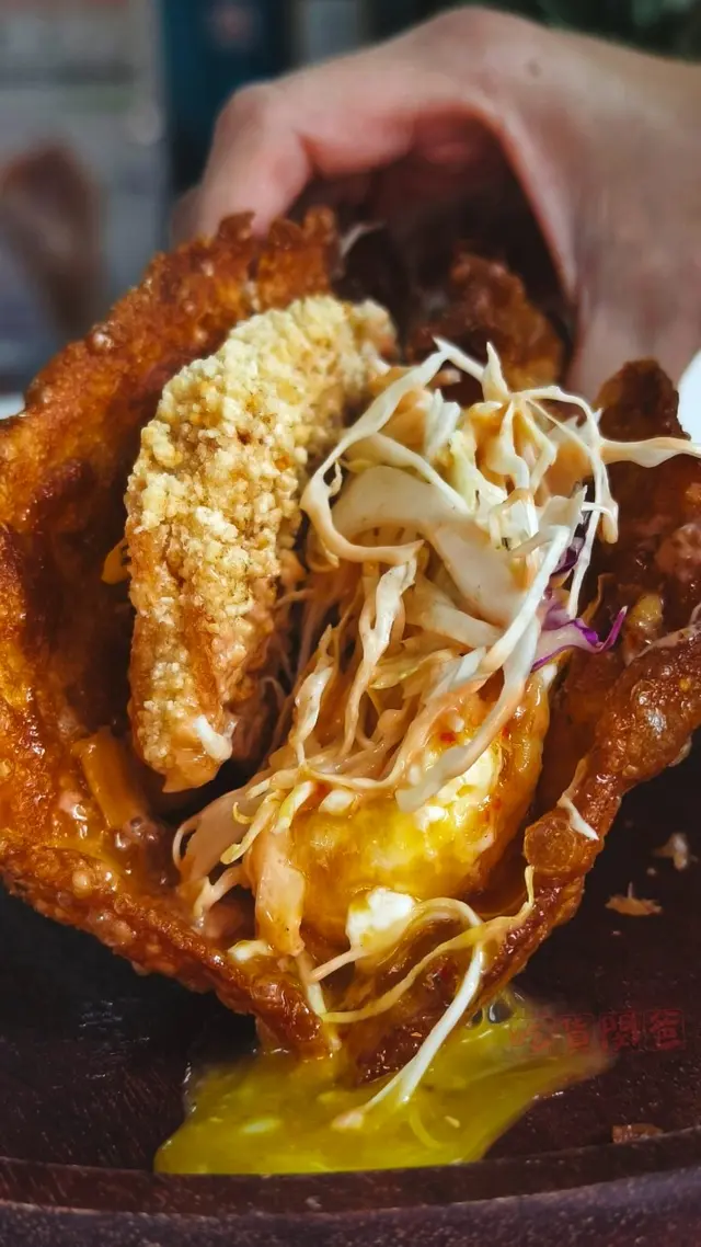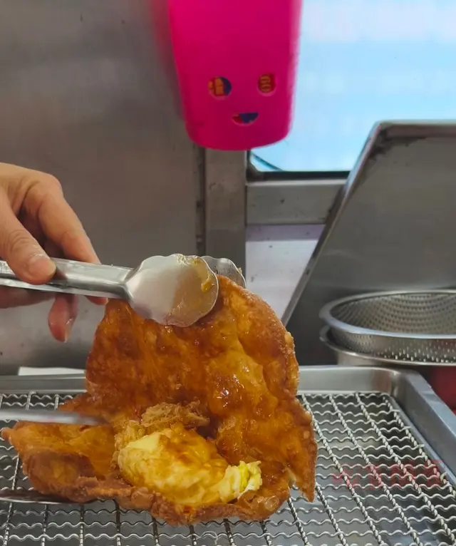 炸蛋蔥油餅要好吃需要功夫,控制餅皮的酥香以及炸蛋要維持半生熟的口感,這樣吃是基本款..
