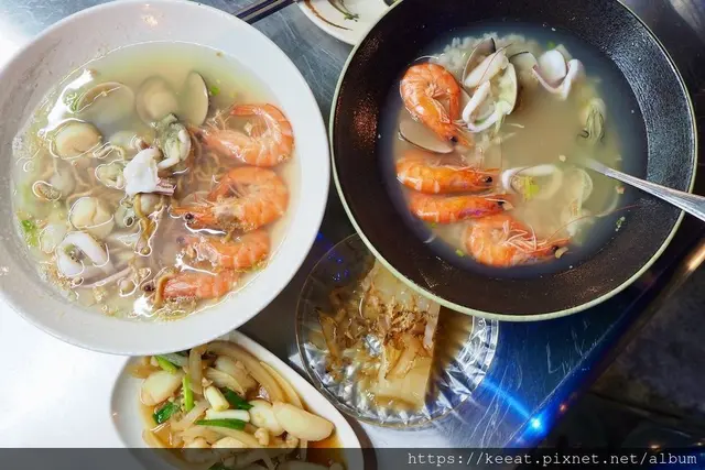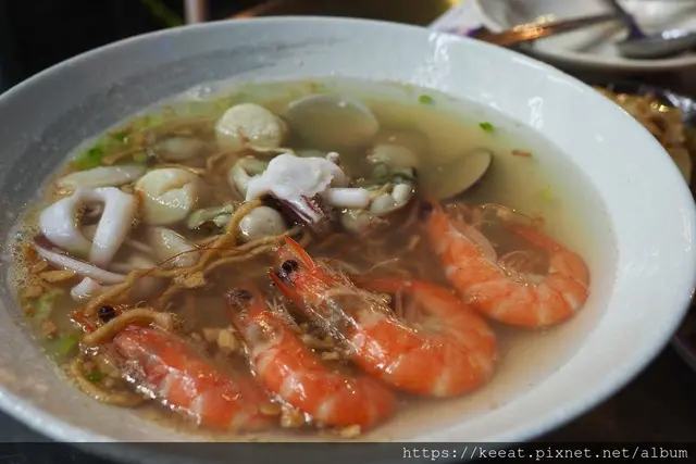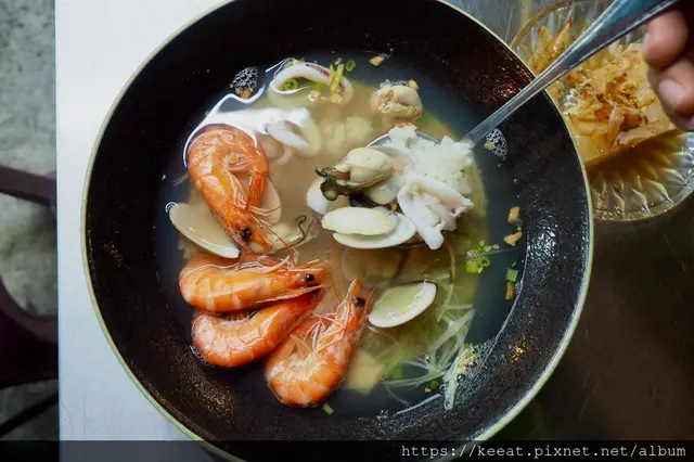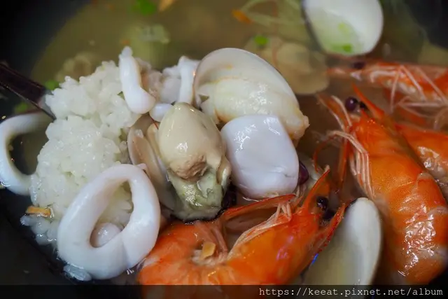 屬於飯湯類型的招牌海鮮粥$140,偽台南友人對於海鮮非常了解,偽台南友人說活跳跳干貝海鮮粥的海鮮是挑選過的,吃起來的口感Q彈,吃起來很鮮甜。