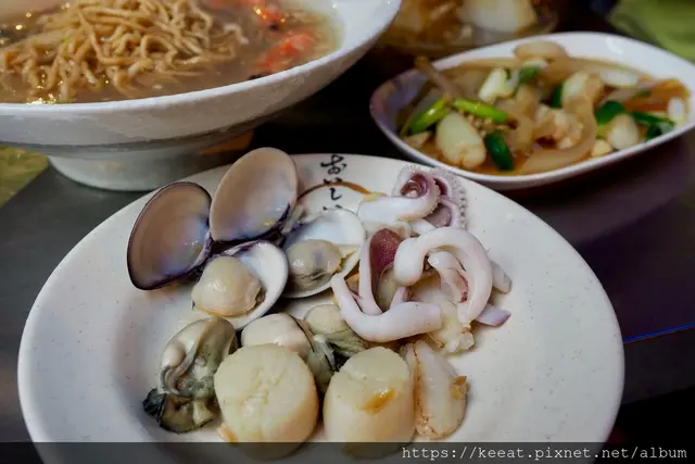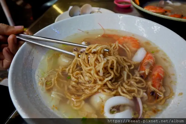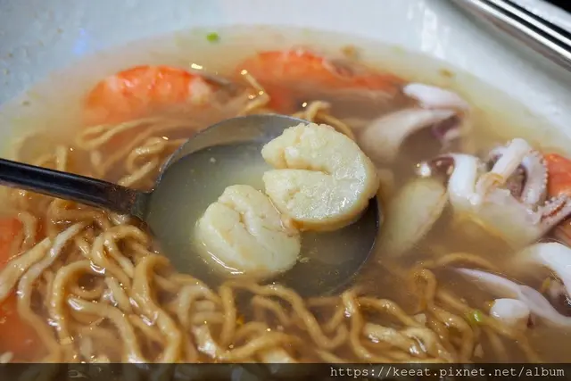 活跳跳干貝海鮮粥的干貝海鮮意麵$170,湯頭加了油炸後的意麵喝起來了一股香氣,跟加了薑味的招牌海鮮粥的湯頭完全不同,台南意麵應該是到台南觀光客必點的小吃之一,身為觀光客的美姬覺得可以吃到海鮮又可以吃到意麵的干貝海鮮意麵真的是個好選擇阿!比沒有干貝的海鮮意麵多了$30,也多了兩顆干貝,不過干貝好不好吃,完全是取決於烹飪的方式跟熟度,美姬覺得用水煮的方式,不能完全表現出干貝的美味,所以美姬會建議大家點海鮮意麵,然後再加點奶油香煎干貝。