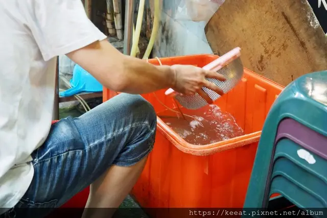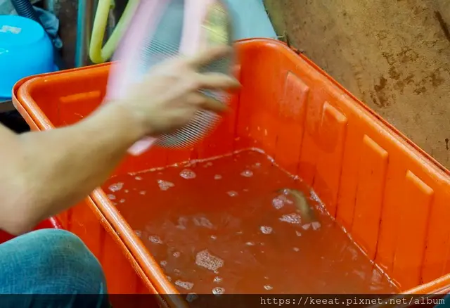 那天同時間店內裡裡外外坐滿了人,大家都在等著老闆煮粥煮麵,熊熊間美姬發現老闆不去煮麵,蹲在美姬座位旁邊的橘色大桶子旁邊,後來仔細一看才知道,原來老闆在撈蝦子啊!難怪店名敢叫活跳跳海鮮粥,真的是現撈活跳掉的蝦子啊!