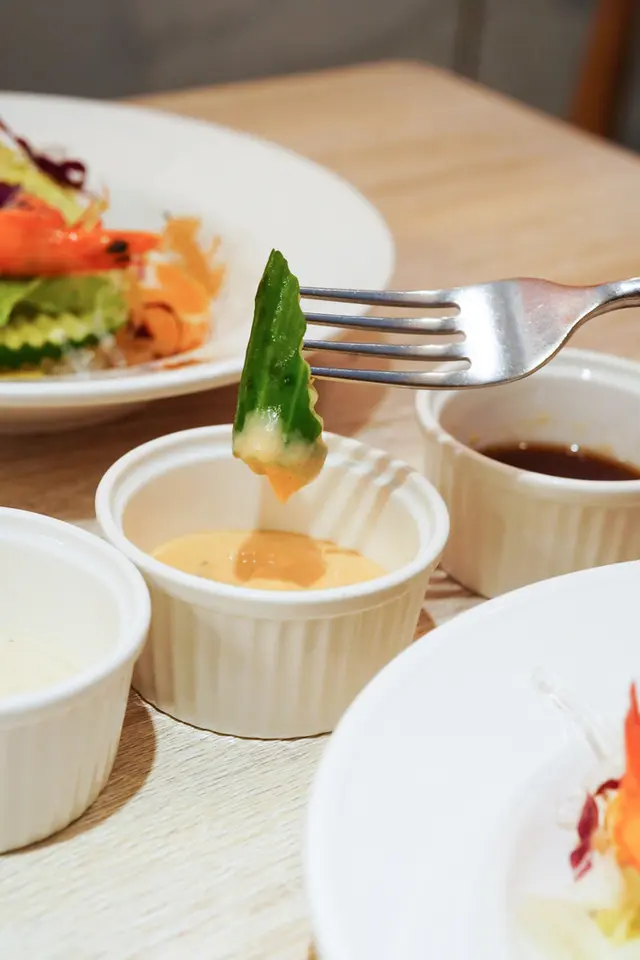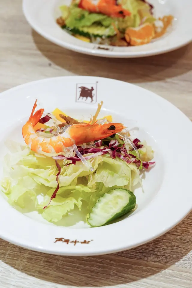 ▼鮮蝦生菜沙拉搭配三種沙拉醬(凱薩/和風/千島),吃肉前先補補蔬菜健康一下😏