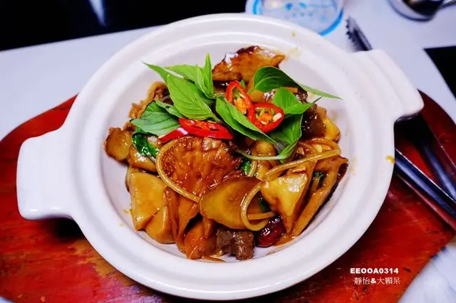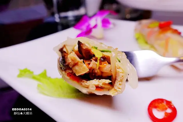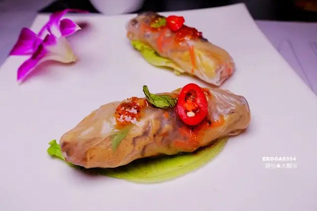 薄透的越式春捲皮內包覆著多種配料與蔬食,淋上香甜酸辣的特調醬料,口感豐富、有層次