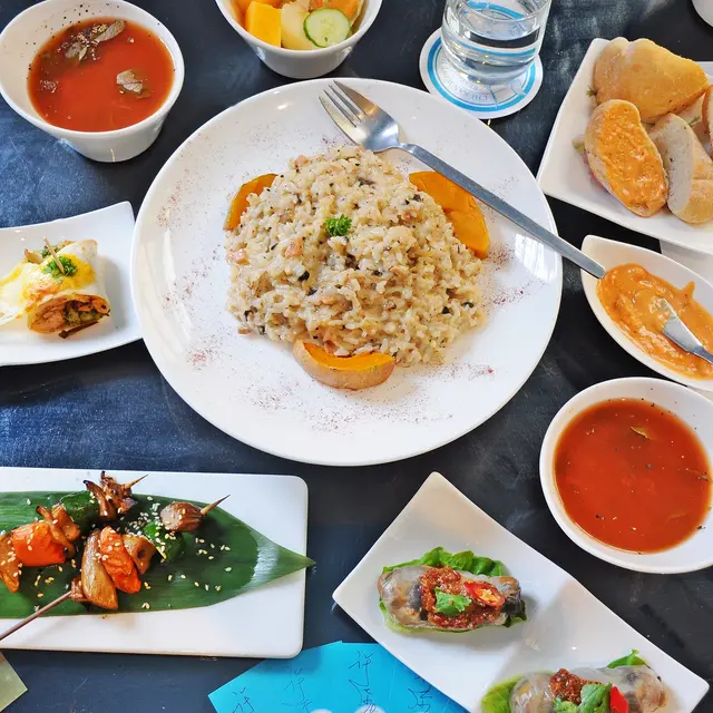 餐廳吃的是異國蔬食料理,亦是各類型菜式都有一點,餐點全素/奶素/蛋奶素人士均可滿足。這次我吃的是「璽樓的餐桌」套餐,跟朋友來吃的話可以根據人數點餐,最低消費二人份,每人NT$680。除了主廚套餐以外,平日亦有價錢實惠的套餐,也有個人火鍋和單點小菜甜點等,選擇很多樣性。