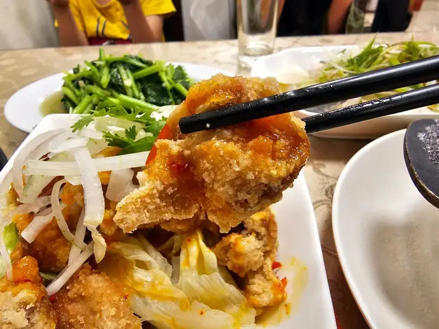 ▼我愛的椒麻雞!外酥內嫩!搭上底層的生菜和泰式甜辣醬甜甜酸辣的口感,清爽又開胃!