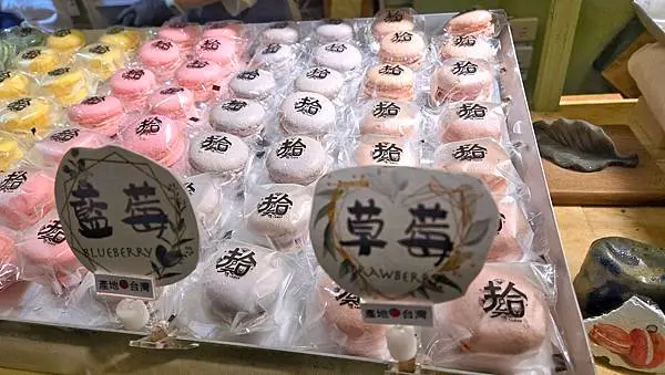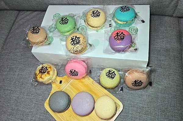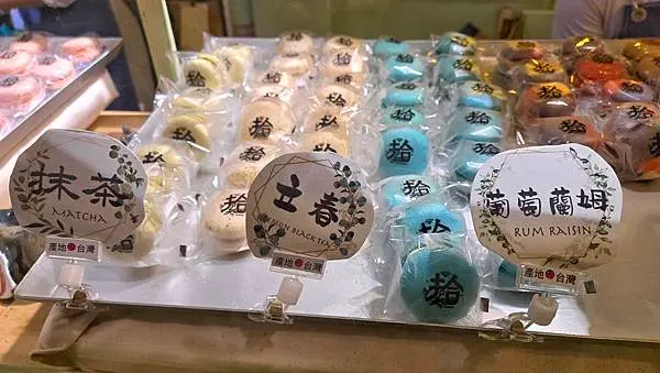 每顆都獨立包裝的馬卡龍,馬卡龍口味有巧克力、費洛蒙之心、抹茶、立春、葡萄蘭姆、草莓、藍莓……等等,每款口味深深吸引我,馬卡龍當成散步甜點零嘴美食,真的很不錯啊!