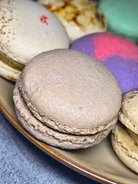 巧克力馬卡龍:這款馬卡龍是經典巧克力風味,以黑巧克力做成內餡,微微苦帶點甜,口感剛剛好