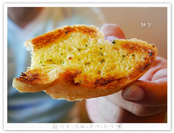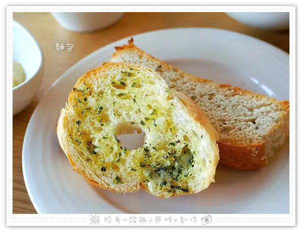烤麵包可續,提供兩種口味,香蒜麵包和佛卡夏麵包。
