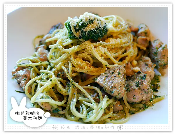舒爽不膩的青醬輔以起司粉,麵條Q彈、雞肉鮮嫩!大推!