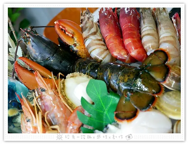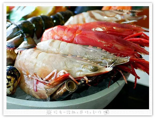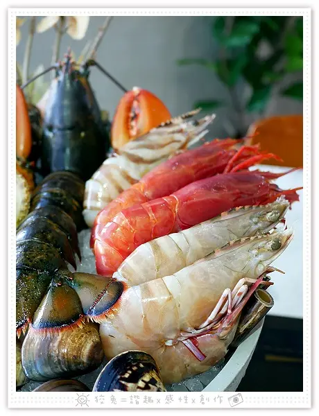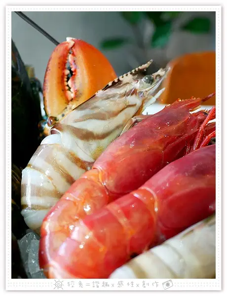 另一邊尚有兩隻去殼半裸露的大天使紅蝦,姿態優雅恰似名伶。