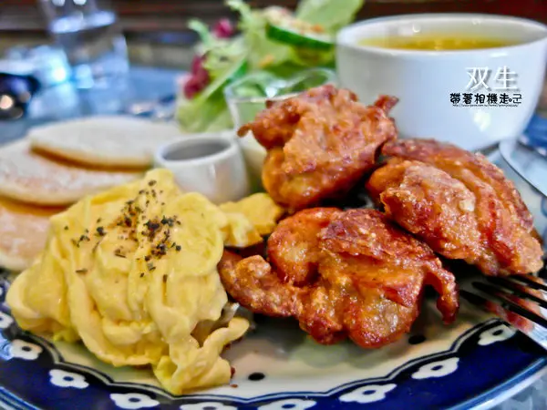 鬆餅、生菜、濃湯、炒蛋、馬鈴薯、唐揚雞