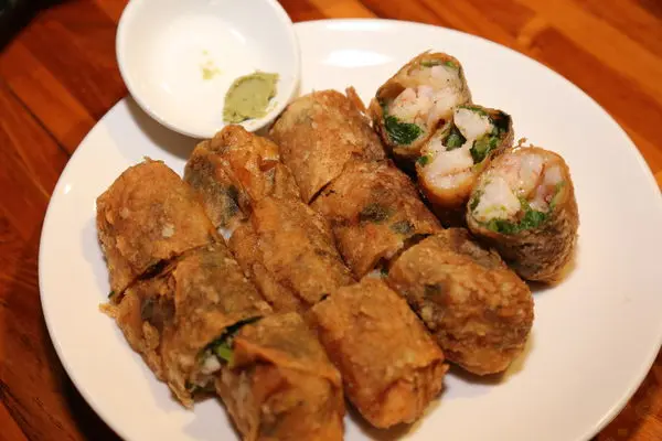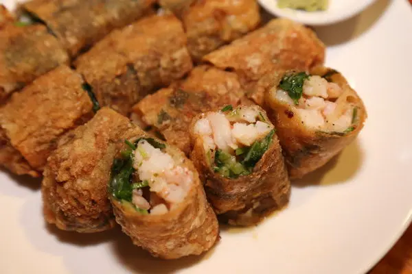 用豆皮新鮮裹住滿滿的蝦子跟九層塔