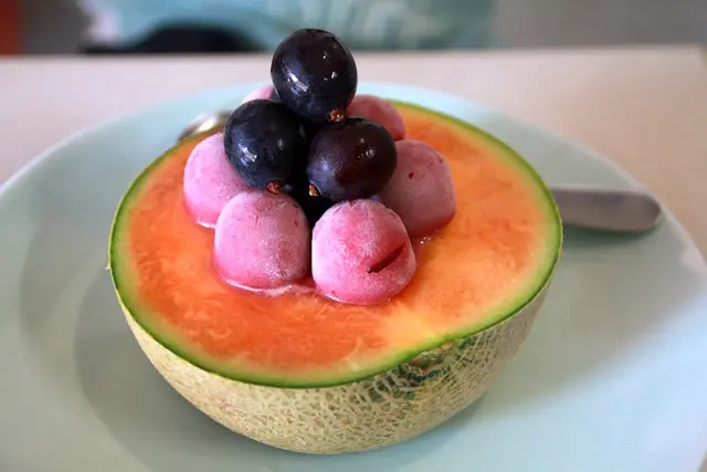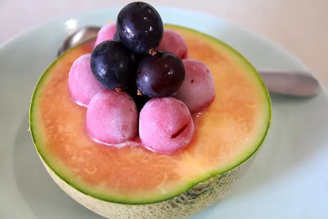 上層是葡萄在下層是葡萄汁冰沙,哈密瓜中間挖空種子由一顆顆葡萄汁冰沙取代
