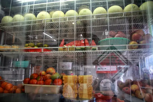 大型的玻璃櫃冰箱擺放著各式各樣的水果,哈密瓜、切片西瓜、蘋果、芒果、鳳梨,疑怎麼會有布丁(圖左)?