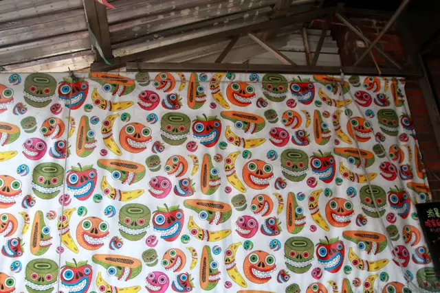 帆布上掛著各式各樣的水果 每個都有眼睛和嘴巴!