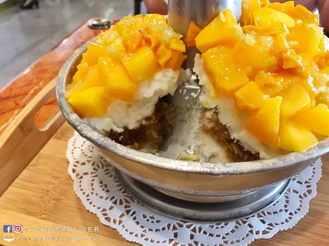 滿滿的芒果十分香甜,底下的冰是牛奶雪花冰加上黑糖冰,吃冰的時候我們有再加上芒果醬,比較清爽。配料還有鳳梨、情人果、芒果果乾,還有玉米脆片,整體而言是好吃的,味道層次分明,但兩個人吃就有點吃力了,份量很足,三到四人吃的話會比較剛好。