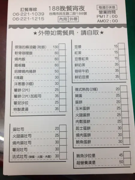 宵夜時刻整條路上就屬這家人聲鼎沸 營業時間:17:00-02:00 但根據我的經驗 通常在七八點熱賣的餐點就會被搶完了 所以如果想吃咖哩飯麻油雞的朋友請早 晚餐時刻就可以去排隊了 不然通常到宵夜時刻只剩下土司跟蛋餅而已