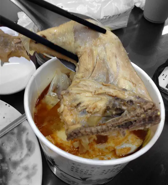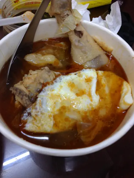 這個超強的麻油雞還會附一碗飯給你 看看這個分量 還有一顆半熟蛋呢!!!! 為什麼叫超強的麻油雞呢 我想是因為... 他有一隻超大 超大 的 雞腿 太OP了拉!!!! 我第一次點就被嚇到了 這怎麼吃的完拉!!!!