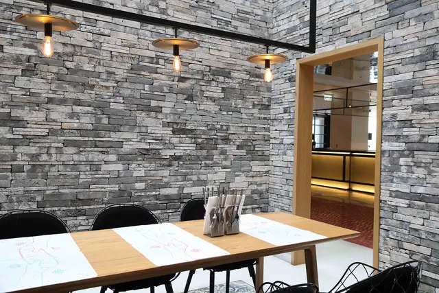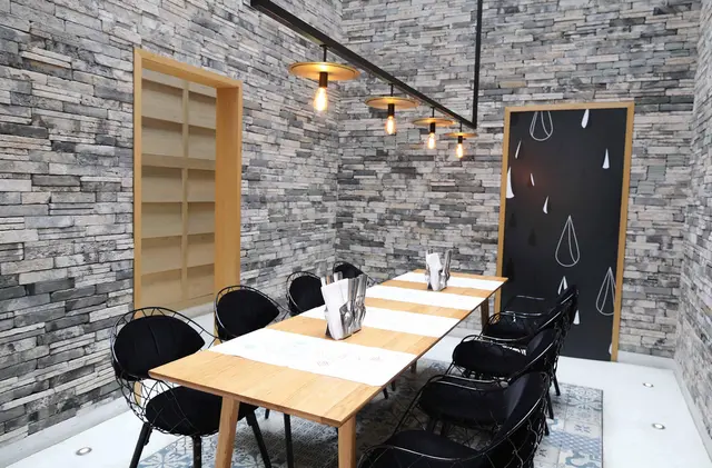 包廂式開天井設計,挑高岩石沏上的牆面,呈現現代質感的氛圍