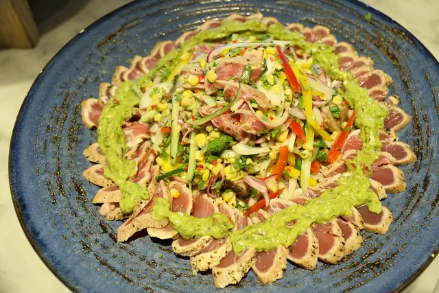 選用大量鮮烤鮪魚切片、多種蔬菜玉米,佐上萊姆醬,特別清爽鮮美
