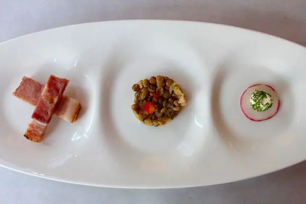 開胃菜是-煙燻火腿+綠扁豆+櫻桃蘿蔔佐蝦夷蔥乳酪