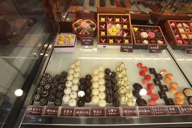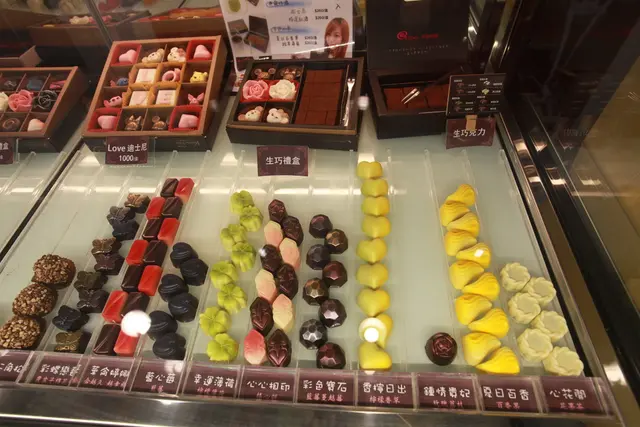 冰櫃裡冰著多種加料有造型的巧克力,口味相當多選擇單顆價錢沒標示有點可惜。