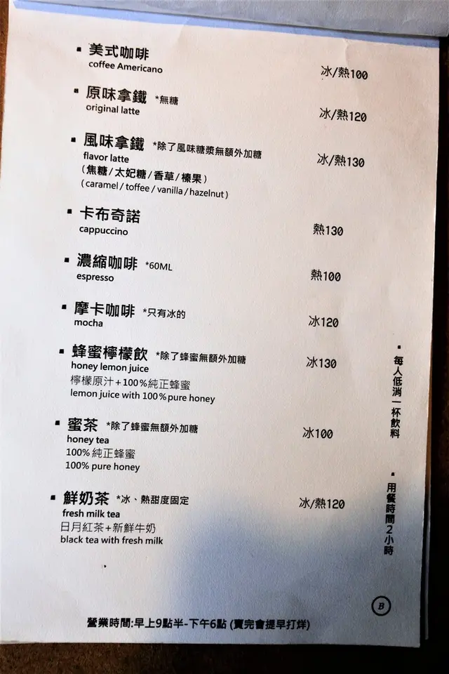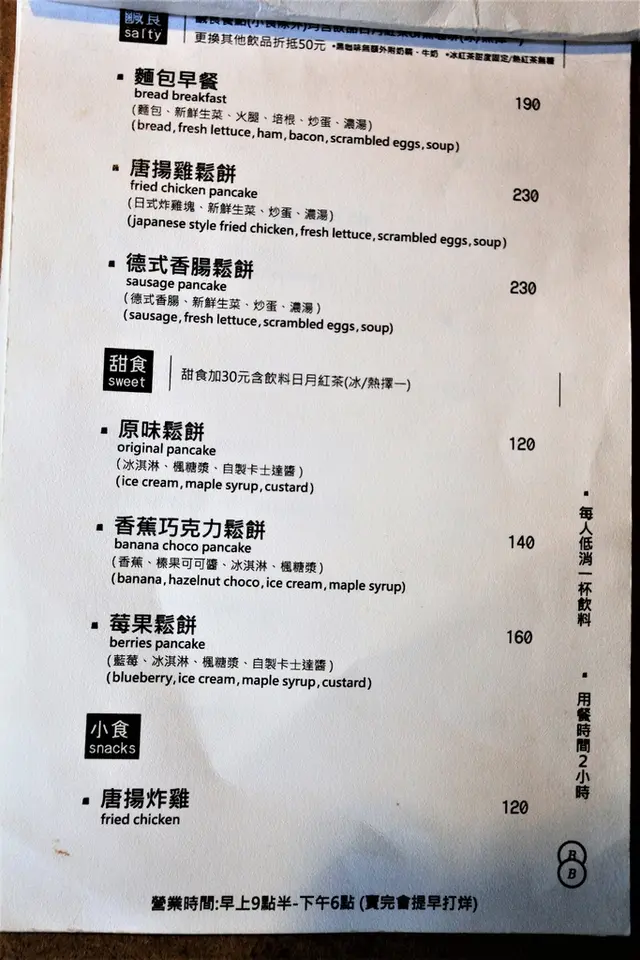菜單設計點單菜色也是簡單,有麵包早餐190元、唐揚雞鬆餅230元、德式香腸鬆餅230元,還有一些單點類與飲品點餐後要先結帳。