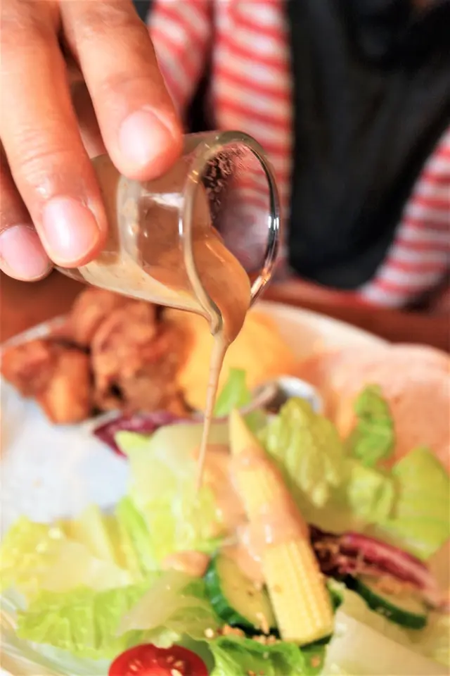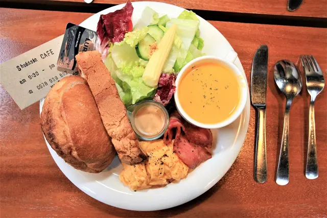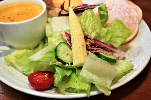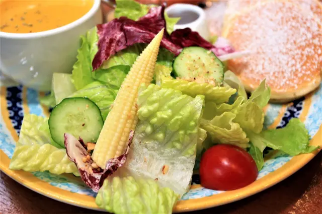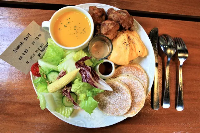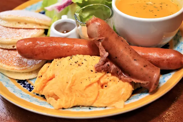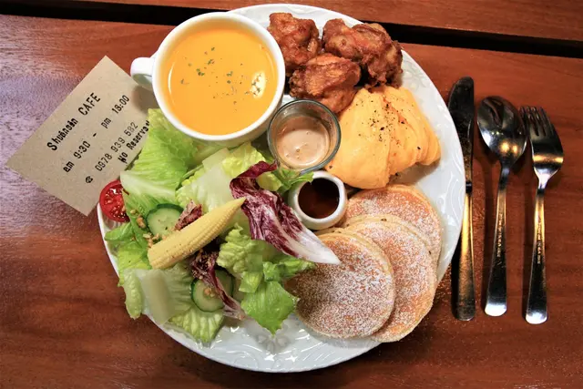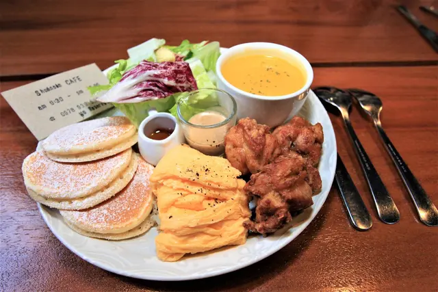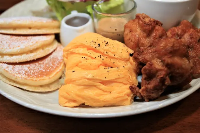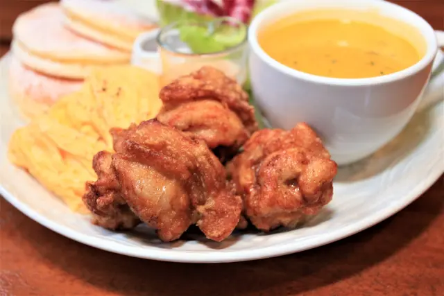 套餐有唐揚雞、生菜沙拉、花生沾醬、圓鬆餅、蜂蜜、蛋捲、煎馬鈴薯、南瓜濃湯與附餐飲料等。