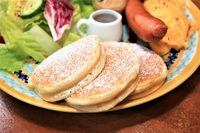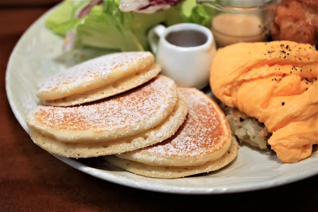 圓形的鬆餅共有三塊上面再灑上糖粉來提味。