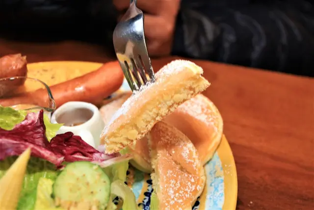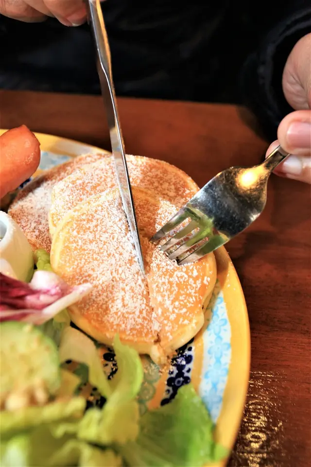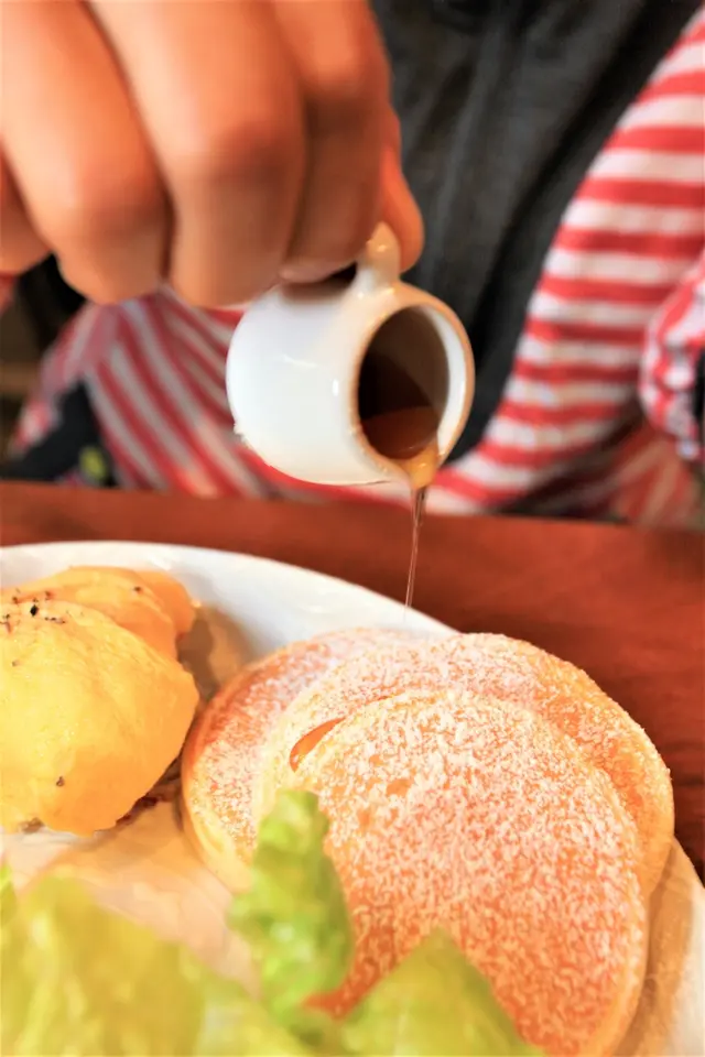 記得把蜂蜜直接淋到鬆餅的上面提味。