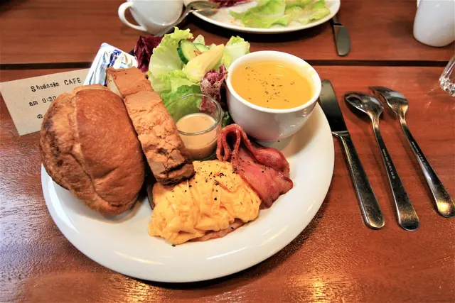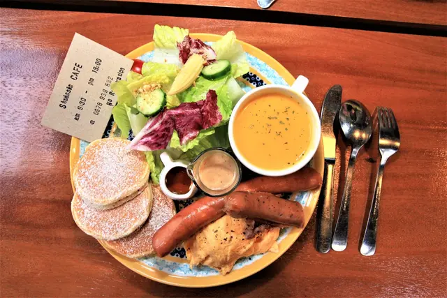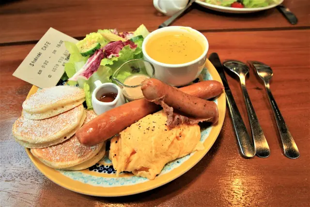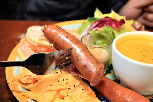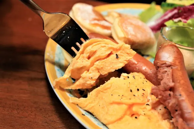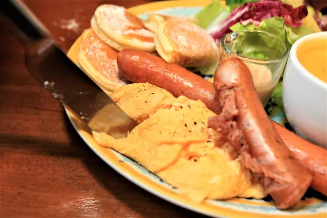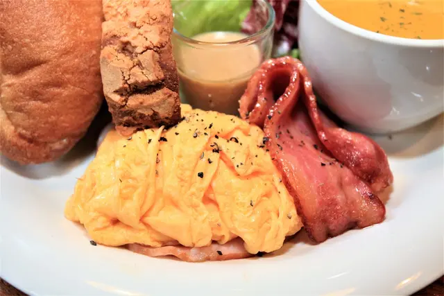 麵包早餐有歐式麵包、蛋捲、煎馬鈴薯、生菜沙拉、火腿、培根、花生沾醬、煎馬鈴薯、南瓜濃湯與附餐飲料等。
