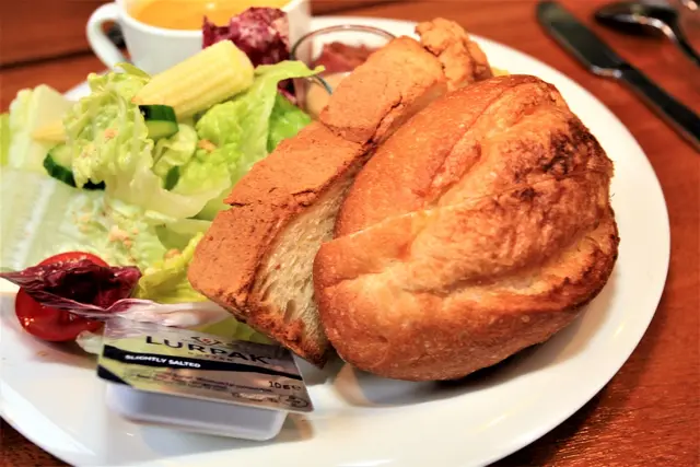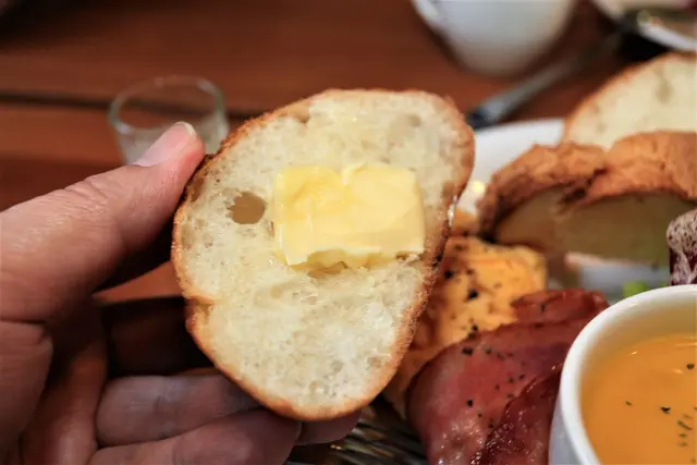 歐式麵包有事先再烘烤過旁邊有個奶油可供使用。