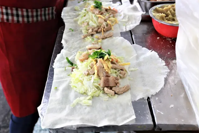 小高有發現包春捲的麵皮還有方形的,包春捲的的配料很豐富有高麗菜、豆皮、蛋絲、肉絲、豆芽菜、紅蘿蔔絲、皇帝豆、花生粉、香菜還有蝦仁等等。