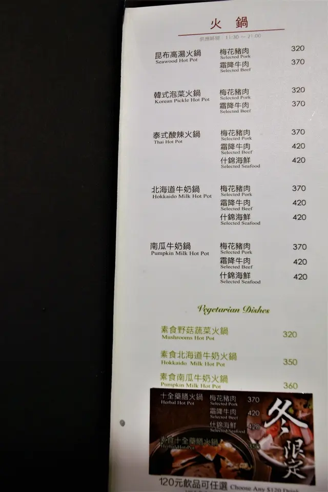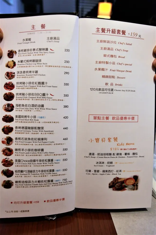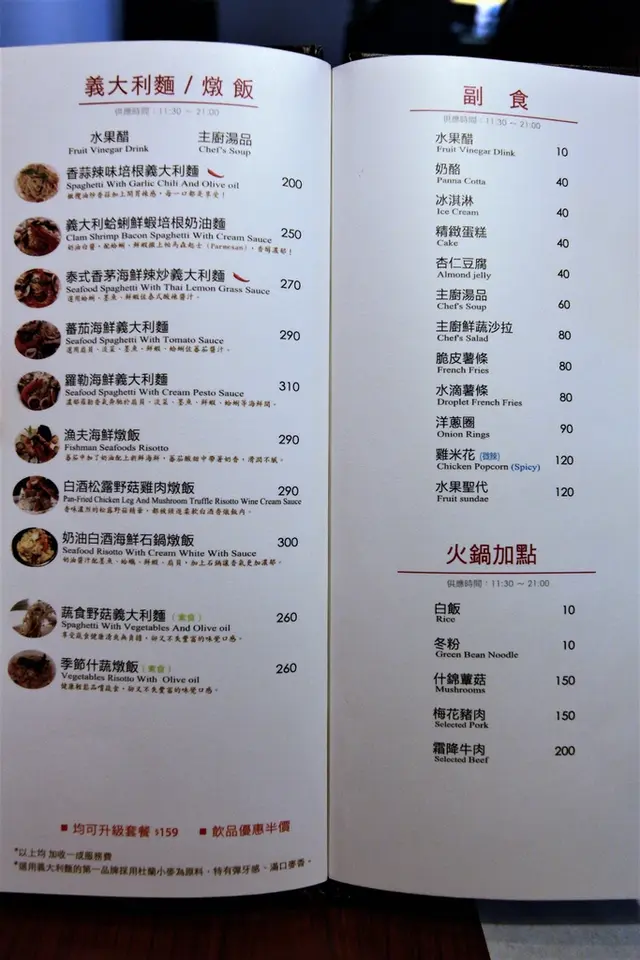 Menu設計簡潔餐點有火鍋、義式料理、甜點與飲品等等,依義法餐廳餐點售價合理,單點主餐可以加135元升級為套餐的優惠。