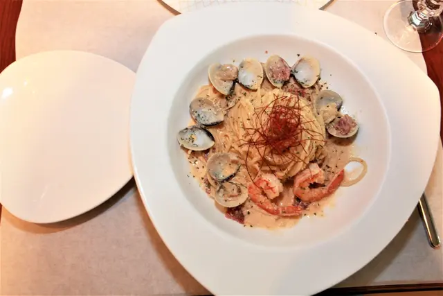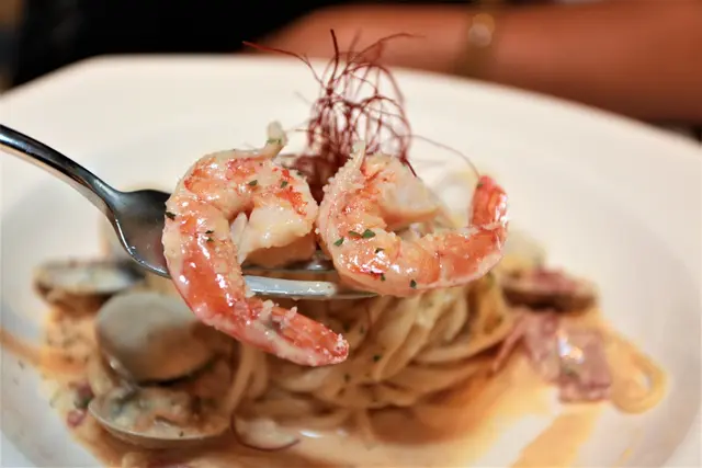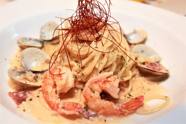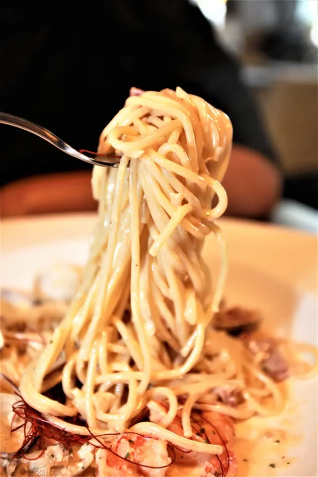 使用奶油與白醬搭配蛤蜊與鮮蝦,灑上帕馬森起司再與義大利麵一起拌炒。