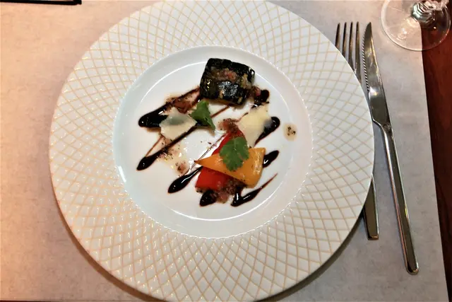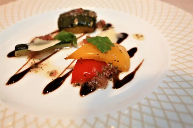 青椒與南瓜搭配主廚特調的醬汁提味好吃。
