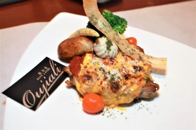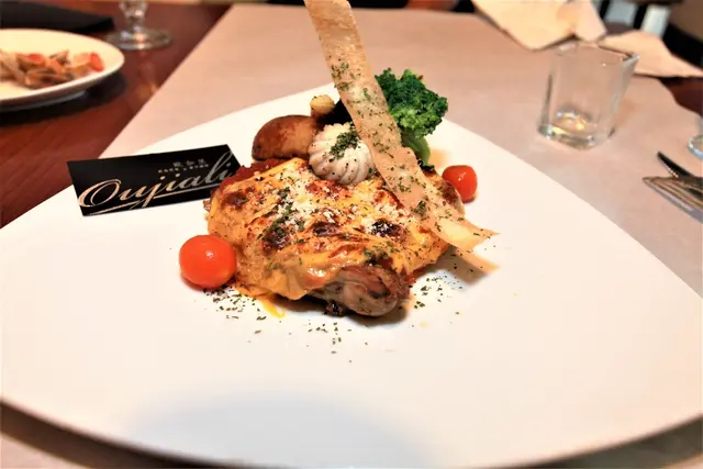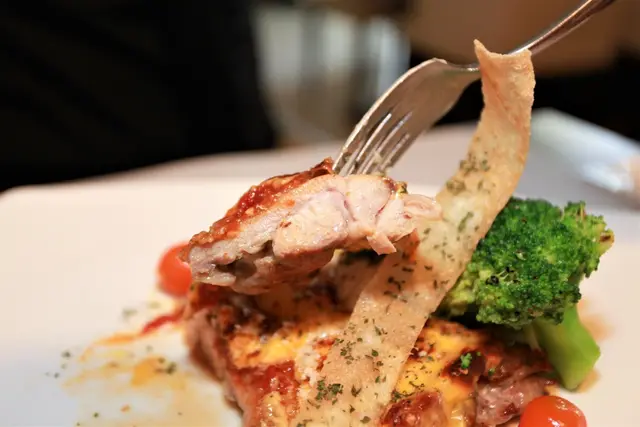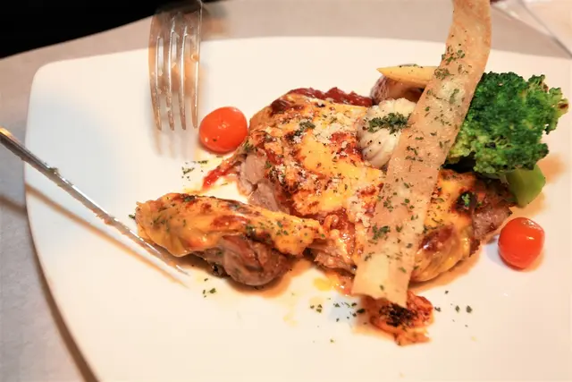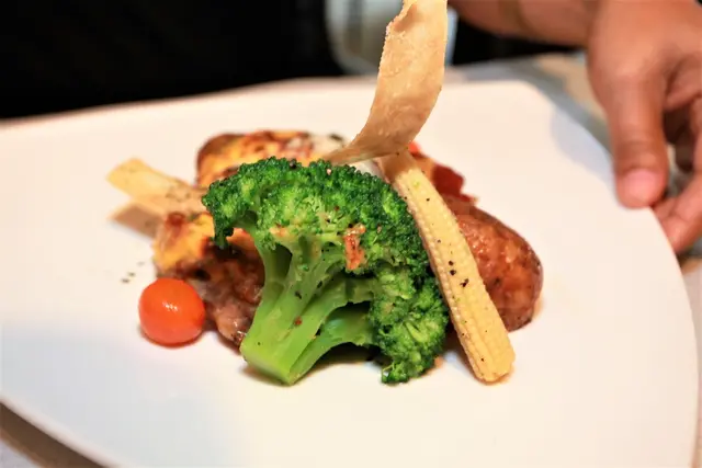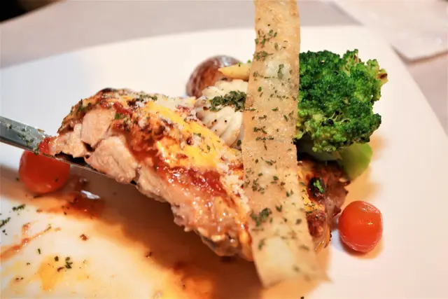 米蘭式雞排是使用去骨雞腿、蕃茄沙司與起司絲製作而成,盤中配菜有綠花椰菜、小玉米蜀、馬鈴薯、小番茄與雕花的蘑菇等等。