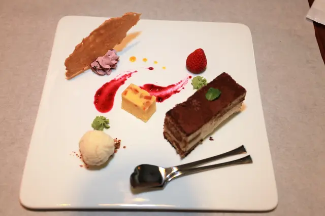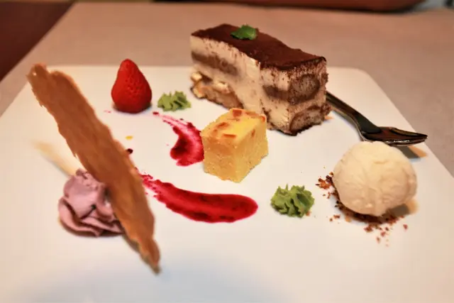 擺盤較為空洞盤中有蛋糕、冰淇淋、草莓與餅乾等等。
