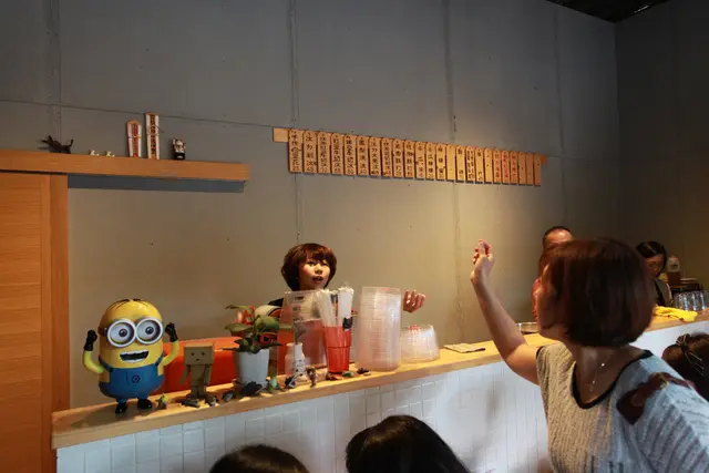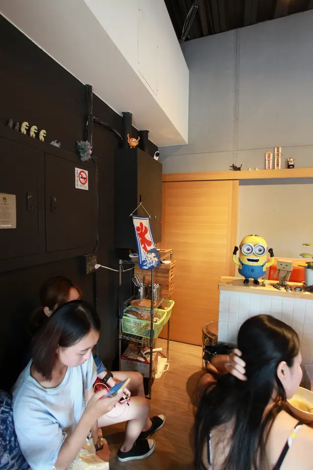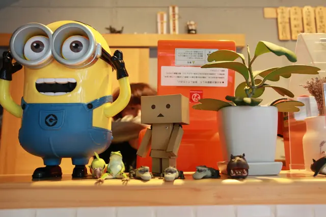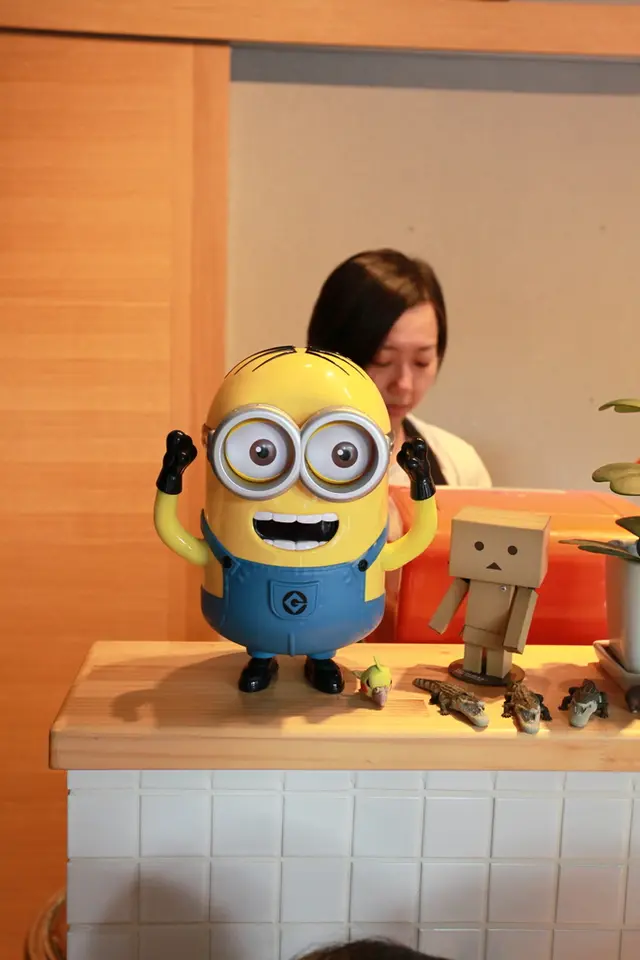 老闆櫃台收藏真不少小小兵及招財貓站還有其他的。