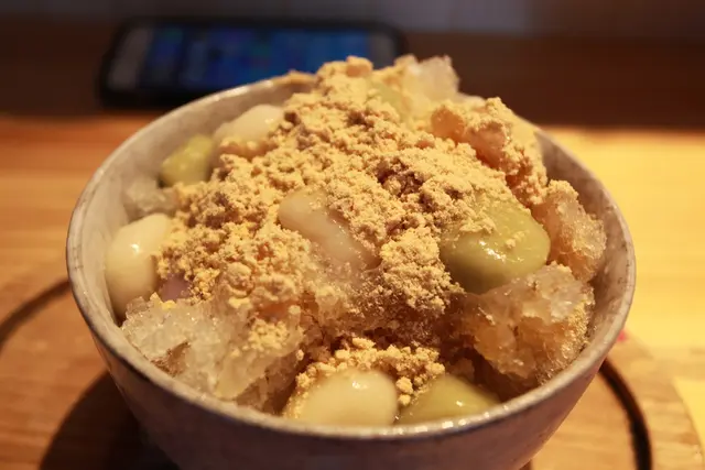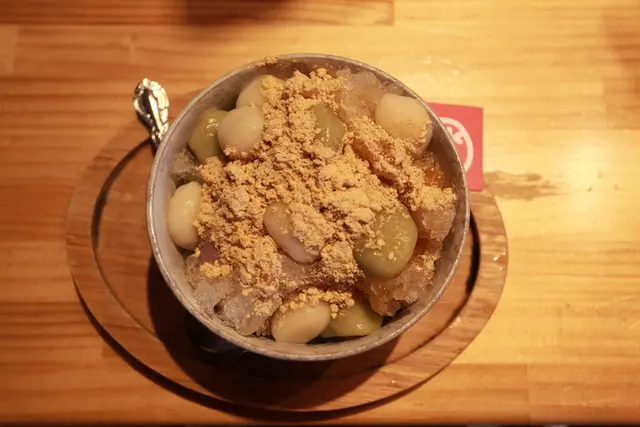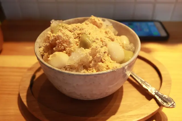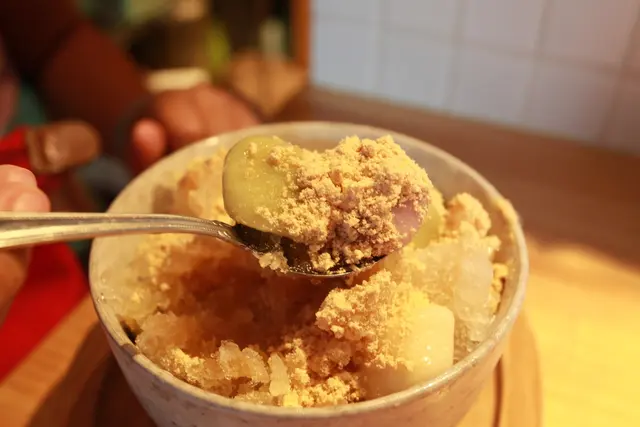 這碗剉冰份量還不小絕對夠您享用,刨冰撲滿了飽滿的湯圓跟麵茶粉真的超級的搭。