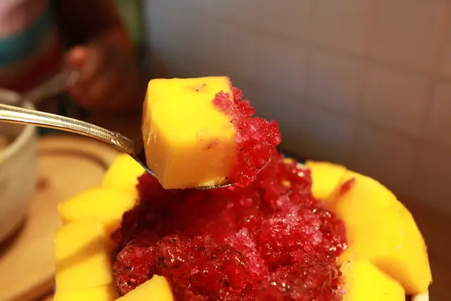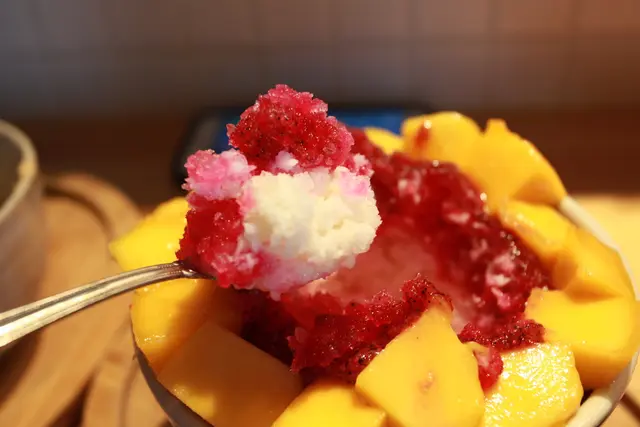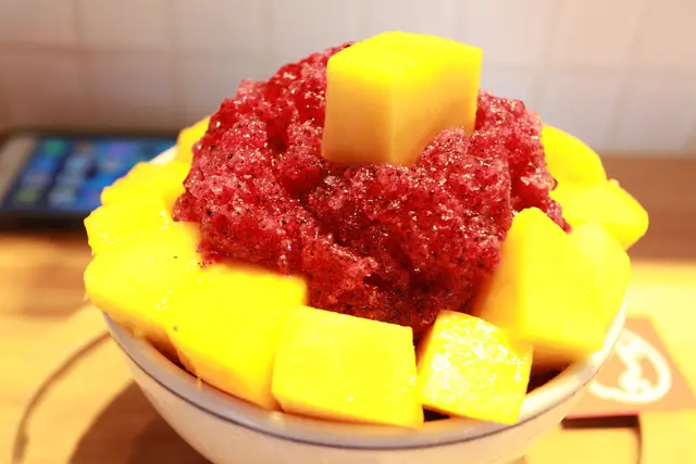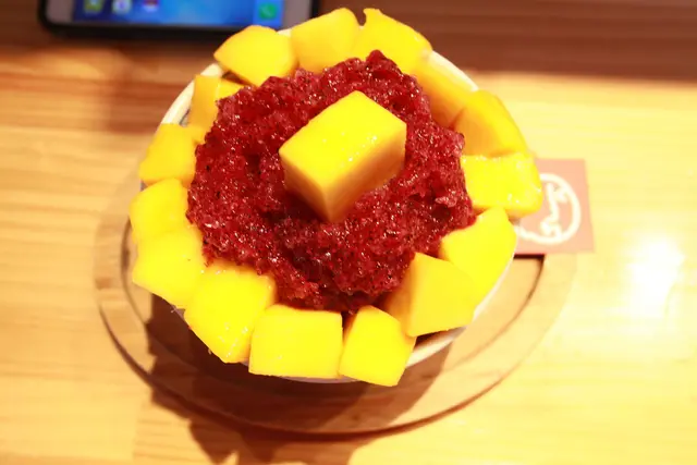 愛文芒果切成塊狀火紅的火龍果打成冰沙搭製成火山。