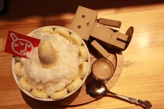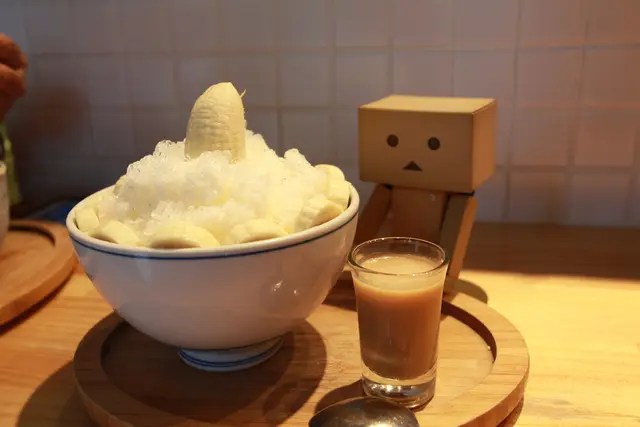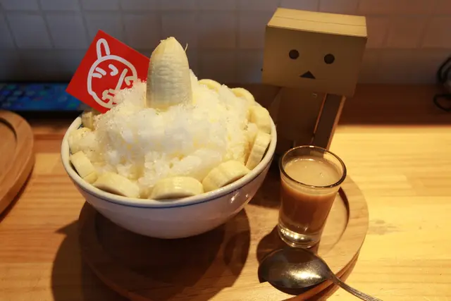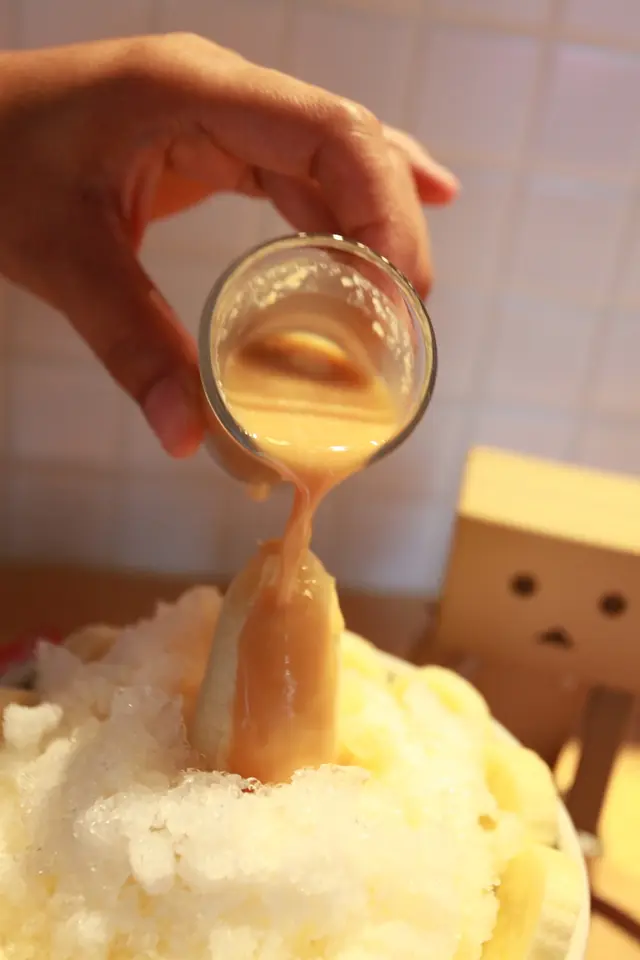 這碗冰會附上一杯調好的牛奶糖的糖水,剉冰在表面會擺上滿滿的香蕉切片。