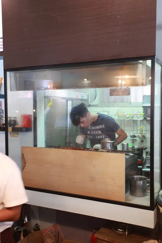 吧檯後方是透明玻璃廚房廚師正在烤鰻魚。