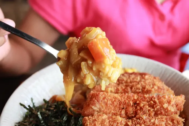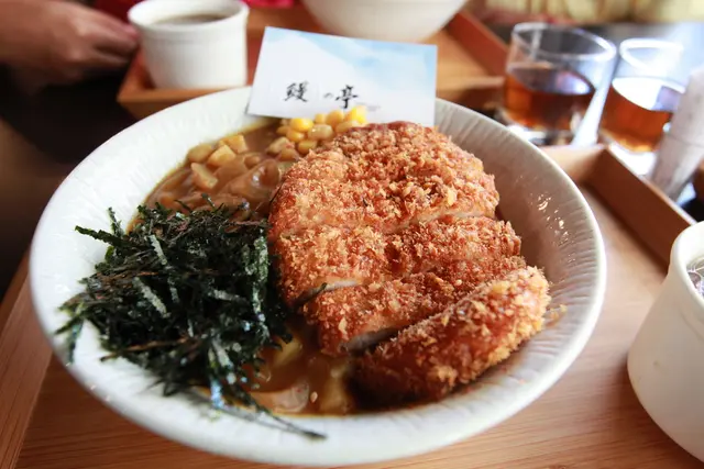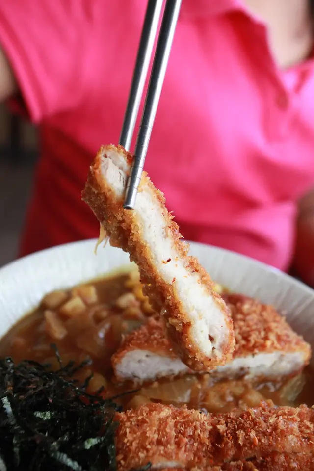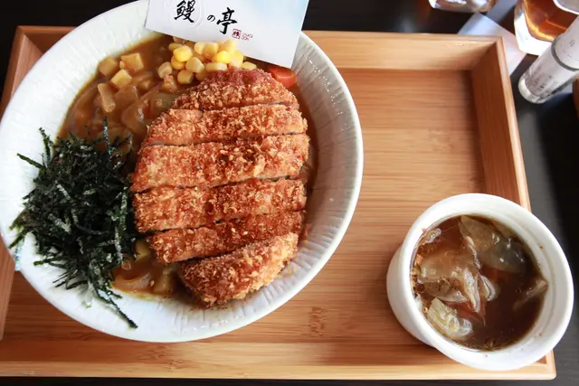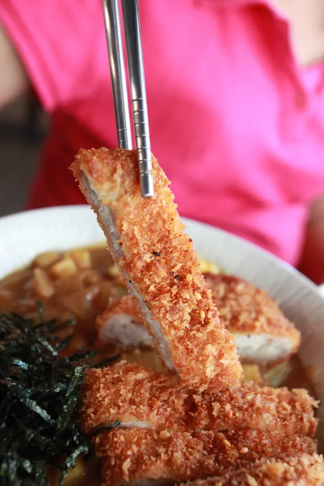 豬排炸的呈現金黃真美觀旁邊擺放海苔絲。