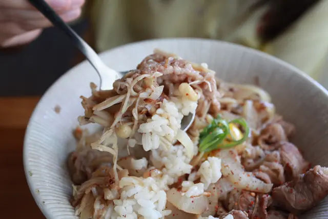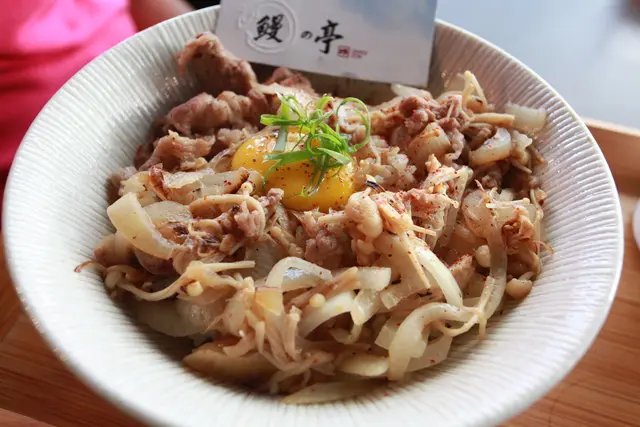 牛肉先與洋蔥拌炒過中間再放顆生雞蛋。