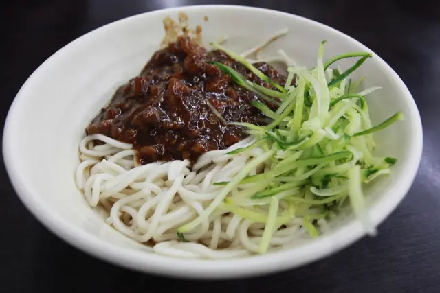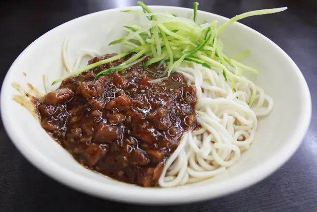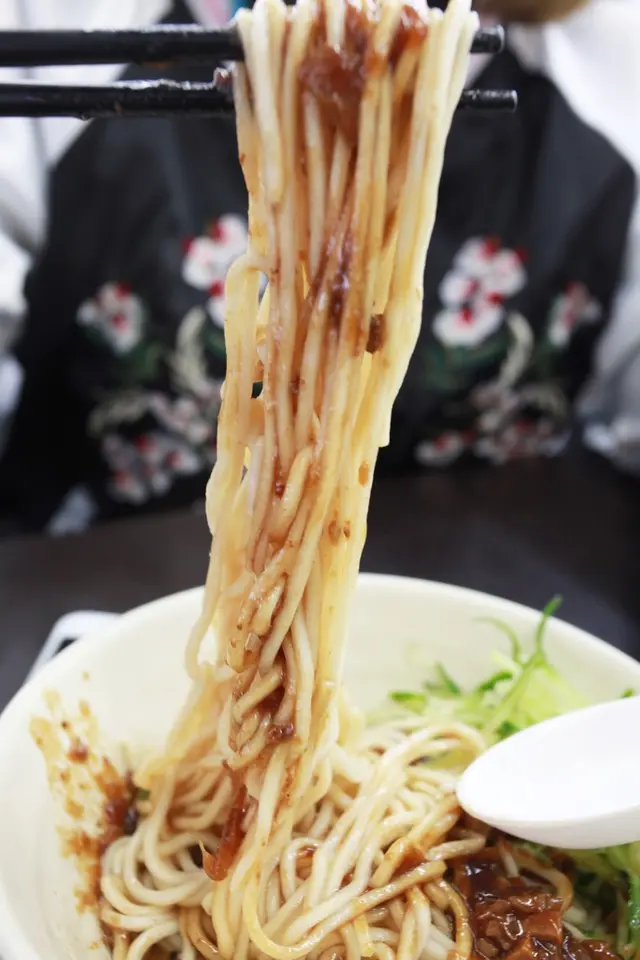 麵條份量足淋上醡醬擺上小黃瓜絲。