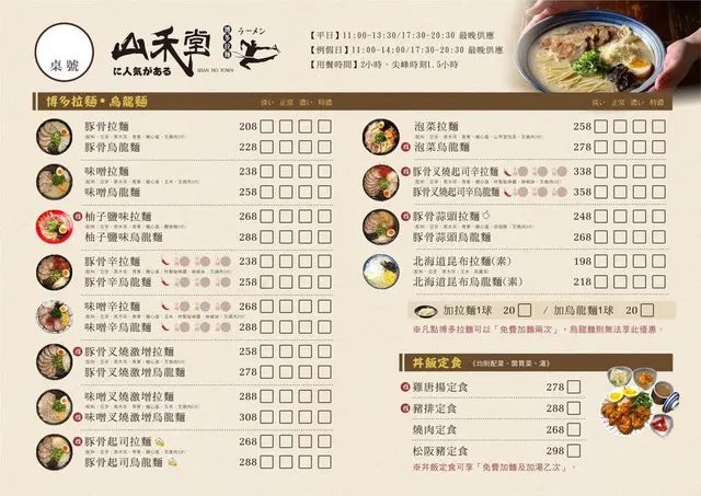 這次來到《山禾堂拉麵-台南館》才發現店家又出菜單,多了火鍋、丼飯定食、創意甜點DIY….等,麵條的種類除了日式拉麵,新增:烏龍麵,整體來說~餐點選項變多、變得更豐富,能滿足不同的用餐需求!